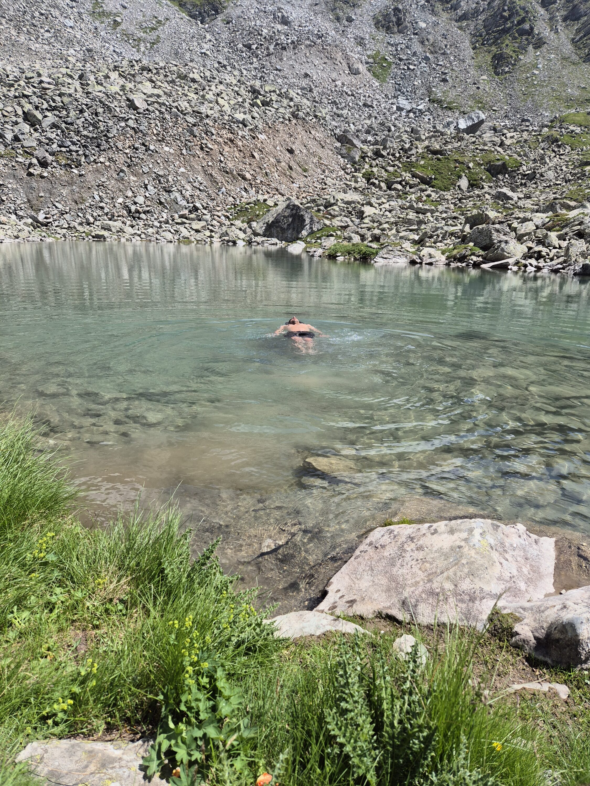 I particularly enjoyed this day for the long conversations with Roni, as we hadn’t seen each other in over a year. About 1.5 km before Col de Mille, a fellow hiker tipped us off about a hidden lake just two minutes off the trail — invisible from our approach — and we couldn’t resist a quick (and freezing!) swim before continuing on to the Refuge de Mille.
