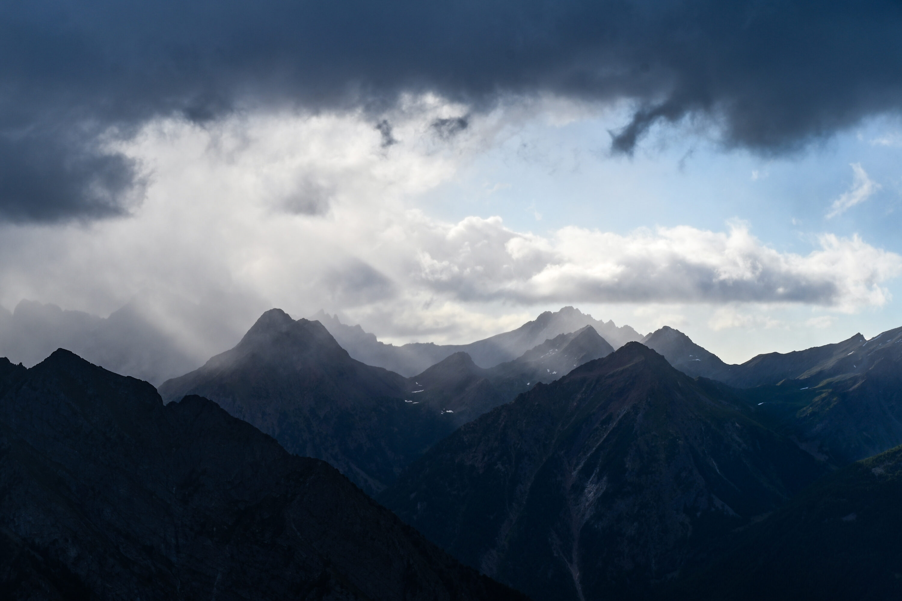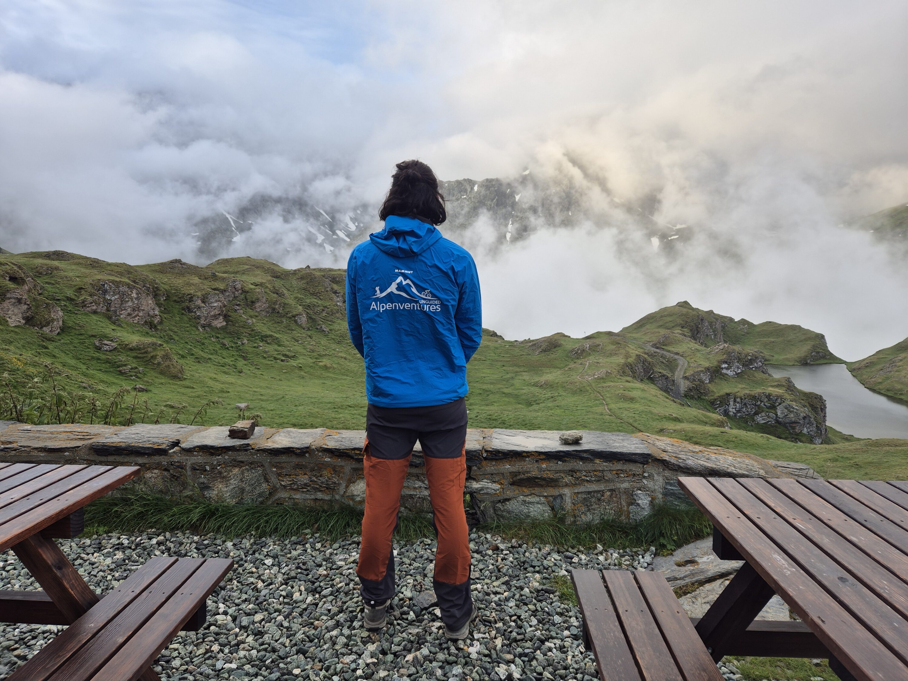 The day we had been dreading finally arrived — 23 km with roughly 1,100 m of elevation gain and loss. Luckily, the storm forecasted for the day had arrived early and hit us during the night, leaving only a bit of a cough from the open window. We woke up to a mystical mountain scene, with clouds drifting between valleys and peaks, hiding and revealing the landscape — truly majestic!